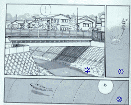 そのかわりに、波紋と、魚の影を描き加えることで、魚のゆったりとした移動を示す。移動を示す流線すらない。しかし読者は、それぞれ自分のイメージした早さで、「魚の泳ぎ」を思い描く。