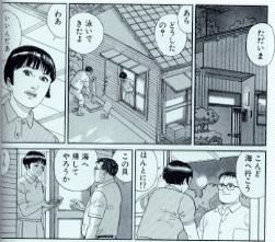 以下のコマは、図書館の帰りにふとガマンできなくなって、学校のプールに忍び込んで泳ぎ、濡れ髪で帰って来た主人公を迎える奥さん・・・というシーンなのだが、